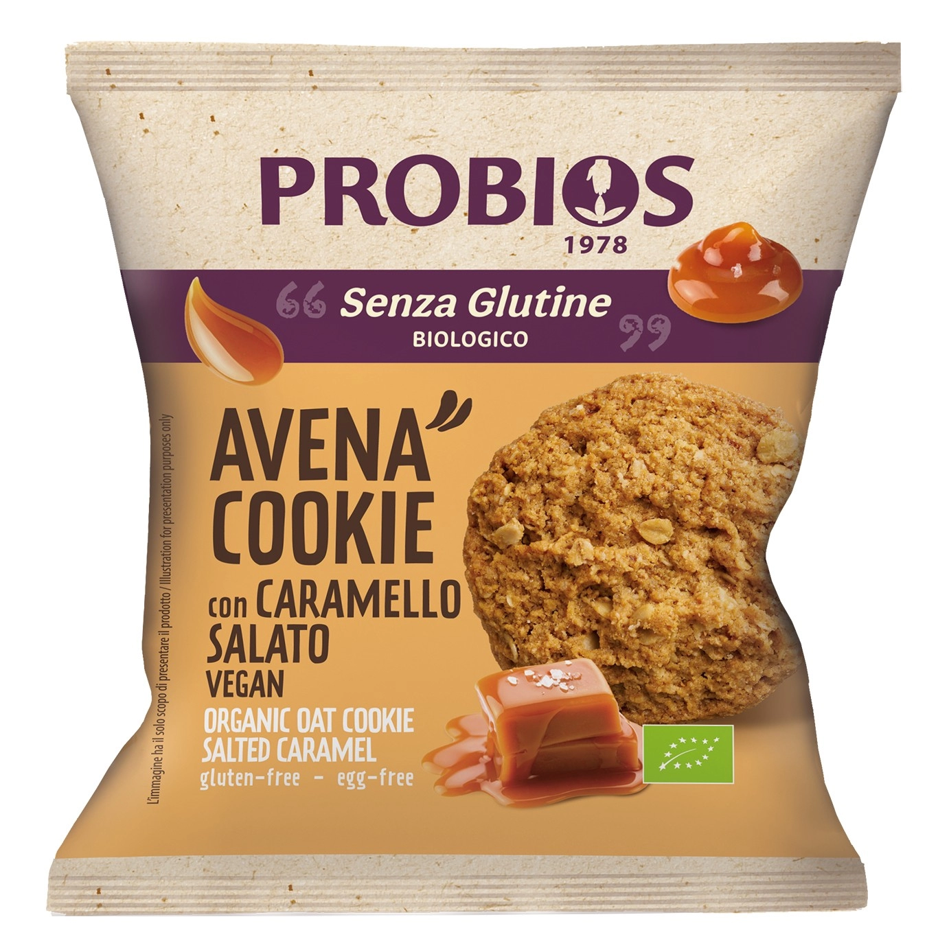 Farina integrale di avena* senza glutine 31,2%, zucchero di canna*, olio di cocco*, fiocchi di avena* senza glutine 9,1%, farina di riso*, olio di semi di girasole*, caramello 1,7%* (zucchero di canna*, sciroppo di glucosio*), sale 1,06%, aroma naturale di caramello; agenti lievitanti: bicarbonato di sodio, bicarbonato di ammonio.