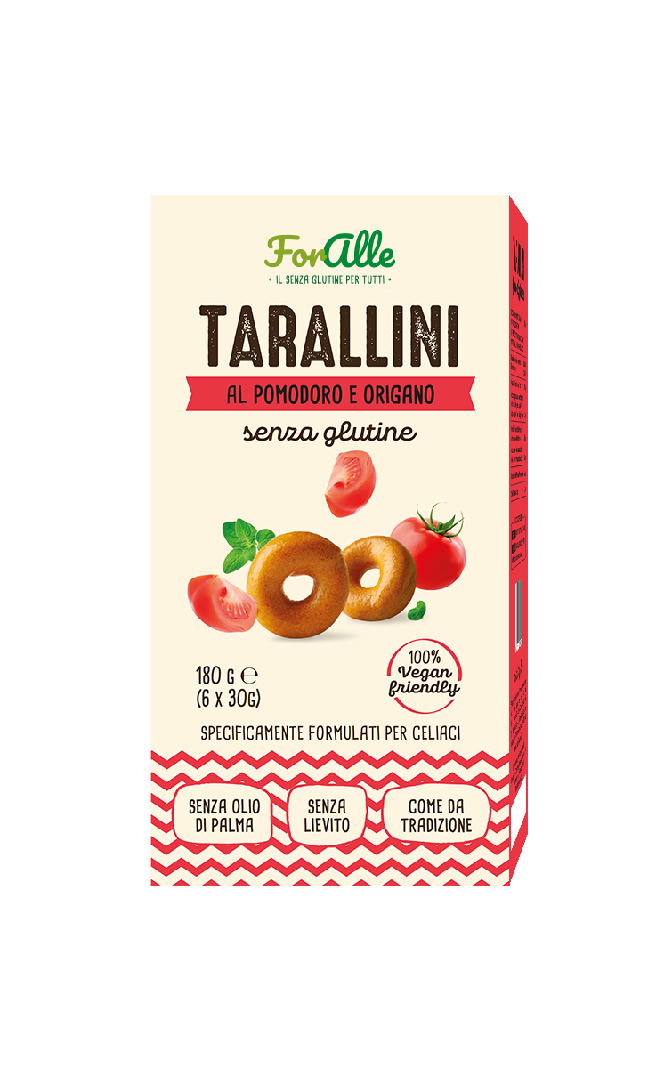 Snack salato senza glutine specificamente formulato per celiaci al pomodoro e origano. Fonte di fibre.