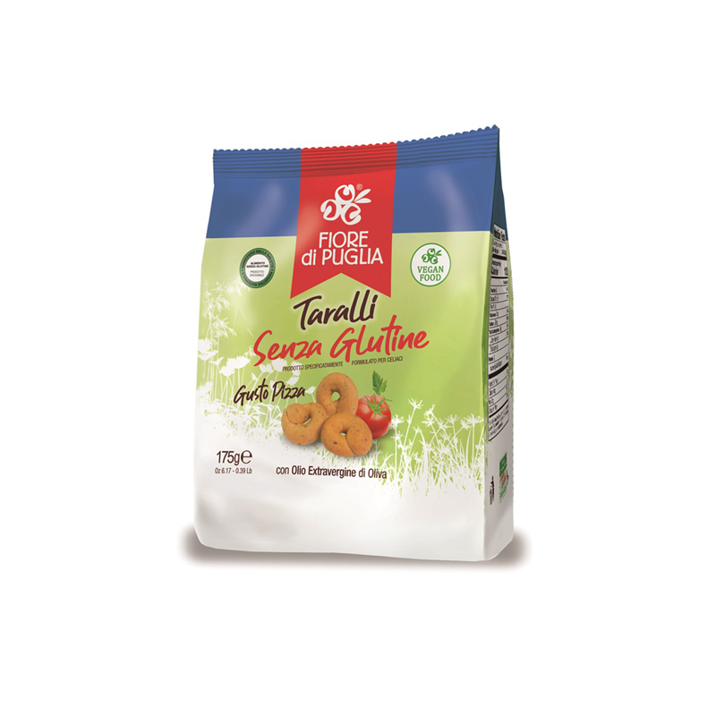 Miscela senza glutine [amido di frumento deglutinato, crema di riso, fioretto di mais, destrosio, fibre vegetali (fibra di psyllium) correttore di acidità (acido tartarico), agente lievitante (bicarbonato di sodio), addensante (gomma di guar), idrossipropilmetilcellulosa, zucchero], olio di semi di girasole alto oleico, doppio concentrato di pomodoro 2,3%, sale, olio extra vergine d’oliva 1,8%, origano 1,2%, emulsionante (lecitina di soia), aroma naturale.