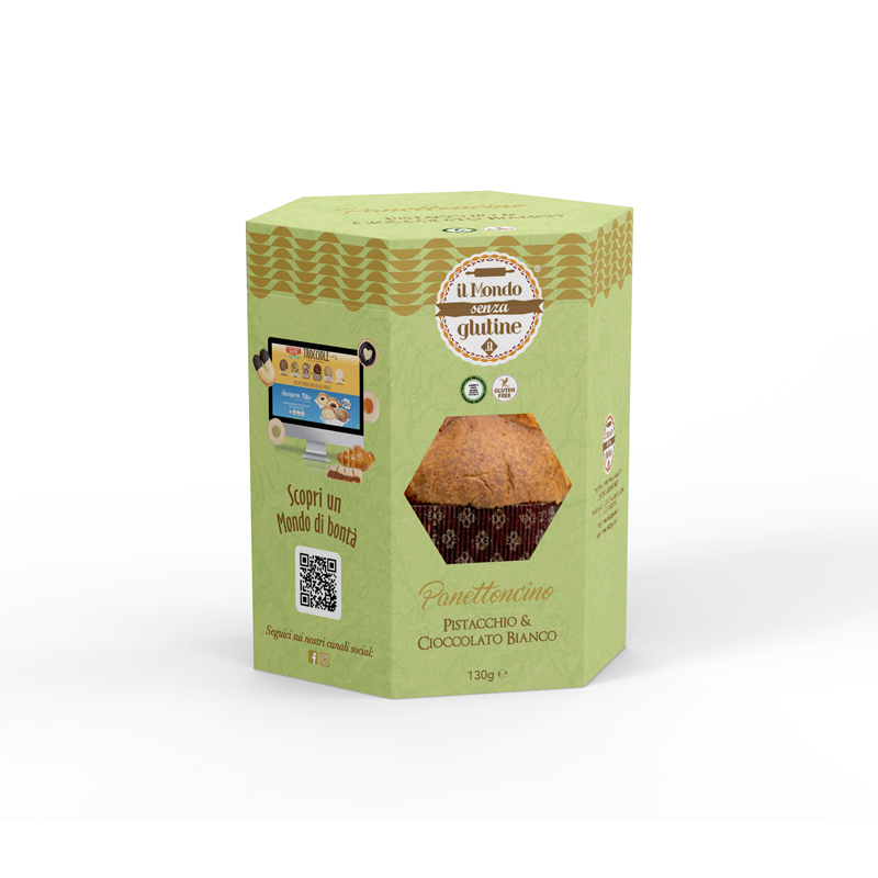 Farine (Amido di mais, amido di riso, fecola di patate, zucchero, emulsionati (esteri lattici dei mono e digliceridi degli acidi grassi, esteri dell 1.2 propandiolo degli acidi grassi), glucosio disidratato, farina di soia, agente lievitante (difosfato disodico, carbonato acido di sodio, stabilizzante: Sali di calcio degli acidi grassi), destrosio, addensanti: gomma di guar, idrossipropilmeticellulosa, fibra di psylium, farina di pisello, vanillina; Margarina Vegetale (oli di grassi vegetali (grassi (palma), grassi parzialmente idrogenati (palma e cocco in proporzione variabile), oli (soia, girasole, mais, colza in proporzione variabile, oli parzialmente idrogenati (soia, girasole, colza e mais in proporzione variabile)), acqua, emulsionanti (E471, E322 lecitina di soia, conservante (E202), correttore di acidità (E330), aromi, coloranti (E160b, E100); Tuorlo d’uovo pastorizzato; Uova fresche intere; Acqua; Lievito di birra; ; Pasta di Pistacchio: (zucchero, proteine di soia, olio di arachide, nocciole, mandorle, pistacchi, latte scremato in polvere, anacardi, aromi, emulsionanti: E471, E472b, E477, E322, noci, estratti vegetali, colorante E133, antiossidante: E307; Gocce di Cioccolato Bianco (zucchero, burro di cacao, latte scremato in polvere, grasso del latte, emulsionante: lecitine (soia), aroma naturale di vaniglia); Granella di pistacchio